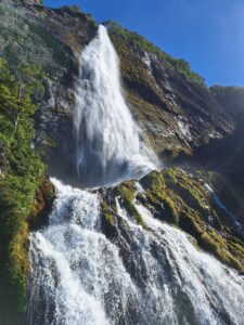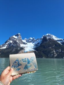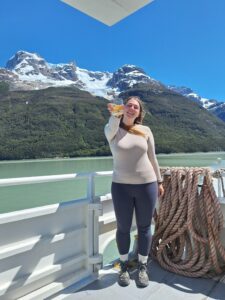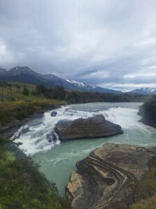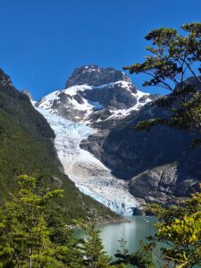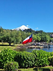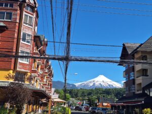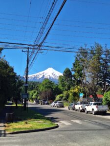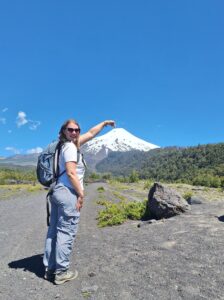 Mijn Patagonië hoofdstuk begint in Pucon, aan de grens van het noorden van Patagonië. Het doet me denken aan Zwitserland: mooie hoge bergen met glooiende heuvels ervoor, veel bomen en koeien in de (alpen)weiden. De huizen in het dorpje zijn uit hout gemaakt en lijken op ouderwetse Oostenrijkse chalets, die wel een likje verf en liefde hebben gekregen. Op mijn eerste dag ga ik met enkele Britten naar een grote waterval kijken, ter voorbereiding op de grote trek over de vulkaan de volgende dag. Wanneer we onderaan de waterval zijn, gaan de Britten zwemmen in het ijskoude water. Aan de kliffen naast de waterval groeien reusachtige bladeren, ik schat dat je er zo eentje wel als een paraplu zou kunnen gebruiken. We lopen de rivier af op zoek naar een plekje in de zon om af te drogen. Omdat de waterval zo hoog is, is de splash-zone dat ook en zijn de paden wat modderig. Ik glijd uit en verstuik mijn enkel heel pijnlijk. We wandelen na even chillen terug omhoog en nemen een Uber terug naar de stad. Ik moet mijn vulkaanbeklimming afzeggen, want wandelen lukt amper. Ik wandel vreemd en alle spieren in mijn linkerbeen proberen te compenseren voor de verzwakte enkel. Ik besluit een wandel-arme uitstap te doen naar de base camp van de vulkaan om zo het natuurwonder toch van dichterbij te kunnen zien. De vulkaan torent dreigend boven Pucon uit, er zijn hier veel actieve vulkanen in de omgeving. Mijn tour deel ik met Jade, een Britse doctor in vulkanologie. Terwijl we in de stoeltjesliften zitten vertelt ze me allerlei leuke feitjes over de vulkaan en eens op basecamp, gaan we stenen zoeken. Ik pik er eentje op waarvan ik denk dat Charles, mijn neefje, leuk zou vinden om te krijgen. Door Jade werd mijn troostprijs uiteindelijk een hele unieke ervaring! Er was die week een conferentie in Pucon met vulkanologen van over de hele wereld, en die dag gingen ze allemaal de trek naar de top van de vulkaan doen. Omdat Jade een slechte knie heeft, kan zij niet mee en zodoende werden we samen geplaatst door puur toeval.